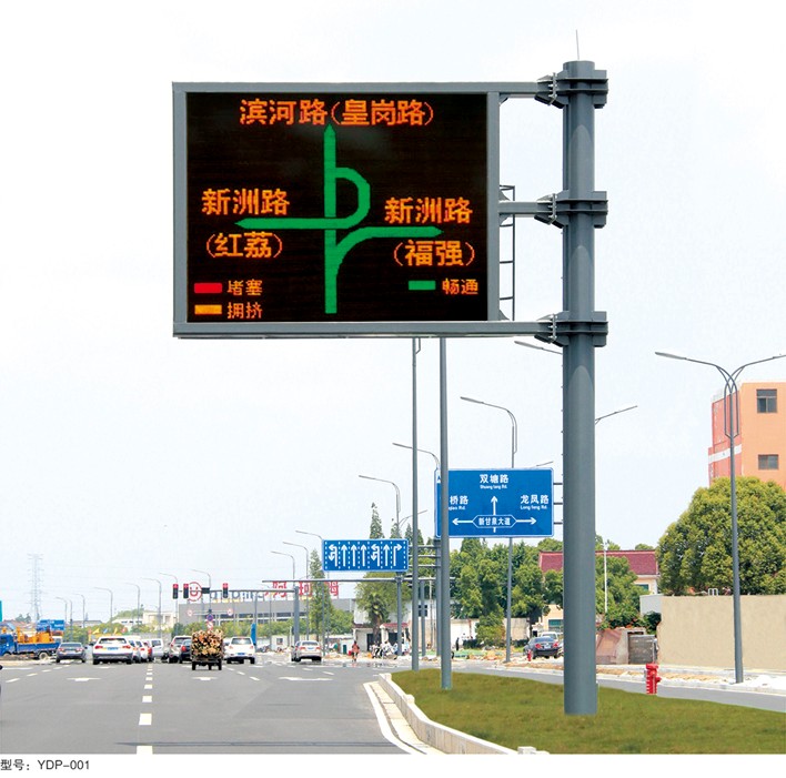 交通誘導(dǎo)屏安裝于城市道路路面上方,為駕駛?cè)藛T提示目前的道路路況信息,交通狀況如:前方施工車禍地點(diǎn)、強(qiáng)風(fēng)、濃霧等警示標(biāo)語;還可顯示誘 導(dǎo)地圖: (紅:塞車;綠:暢通;黃:擁堵)等,以便駕駛?cè)藛T能更好地掌握目前的路況情況,避免交通堵塞,減少交通事故的發(fā)生。