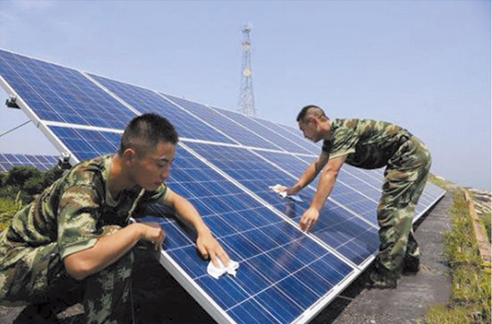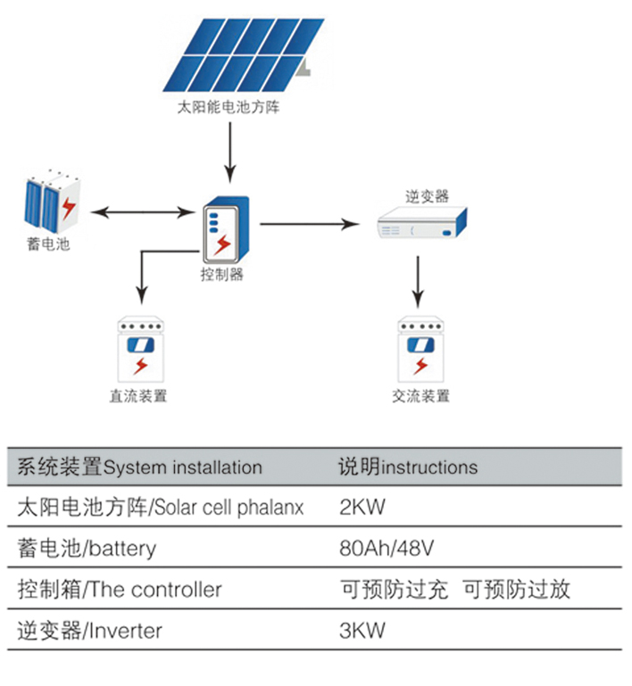 白天通過太陽電池方陣發的電儲存在蓄電池電池中,滿足軍隊營區生活照明和辦公設施使用。
